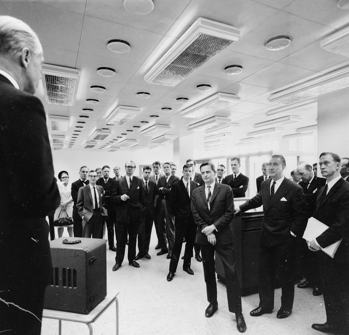 Postbankschefen Lönnqvist välkomnar besökarna till Postgirots dataanläggning, i våningen 4 trappor, i Postgirohuset.