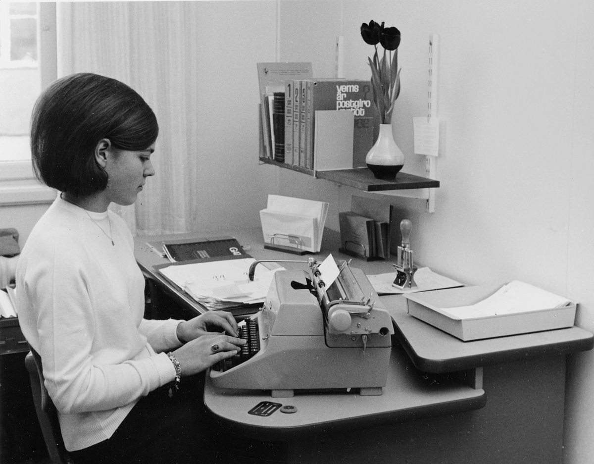 Korrespondensavdelningen. En av de 15 damer som skötte korrespondensen. Facit skrivmaskin och Nobö specialbord med vinkel, samt höj- och sänkbart, det första i sitt slag.