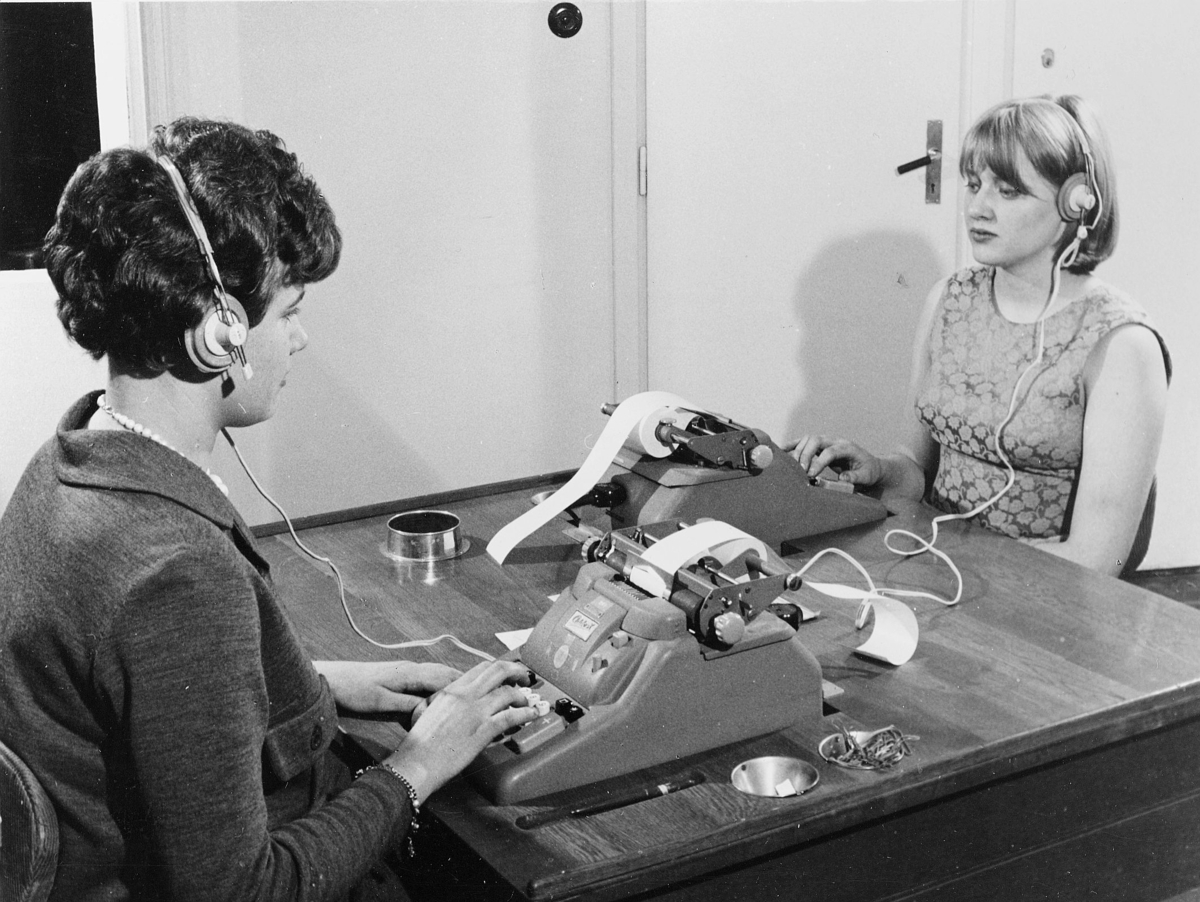 Personalavdelningen. Girokursen: övning i maskinslagning via kassettband - genom hörlurar.