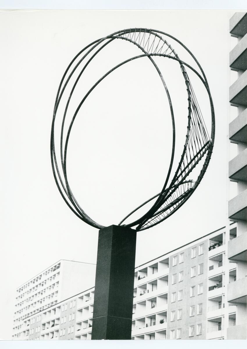Skulptur, av koppar, "Sfär". 7 m. hög med granitsockel.