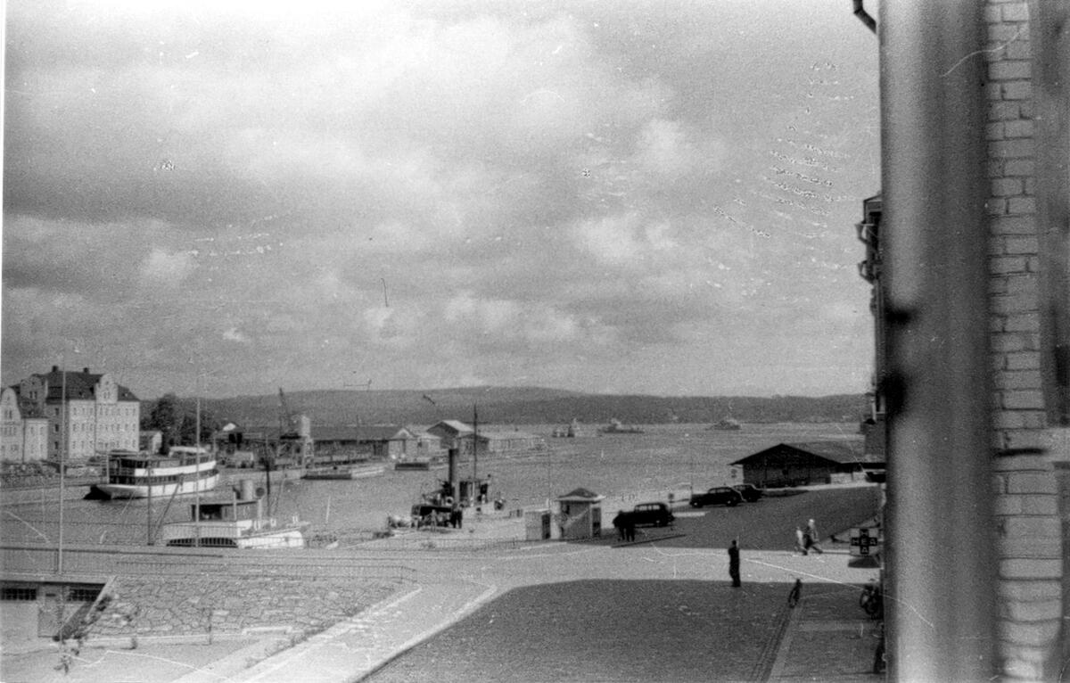 Bilden tagen från huset bakom Blombergs vid Skeppsbron, Nybrogatan går tvärs igenom bilden, magasinen på Kronholmen till vänster.