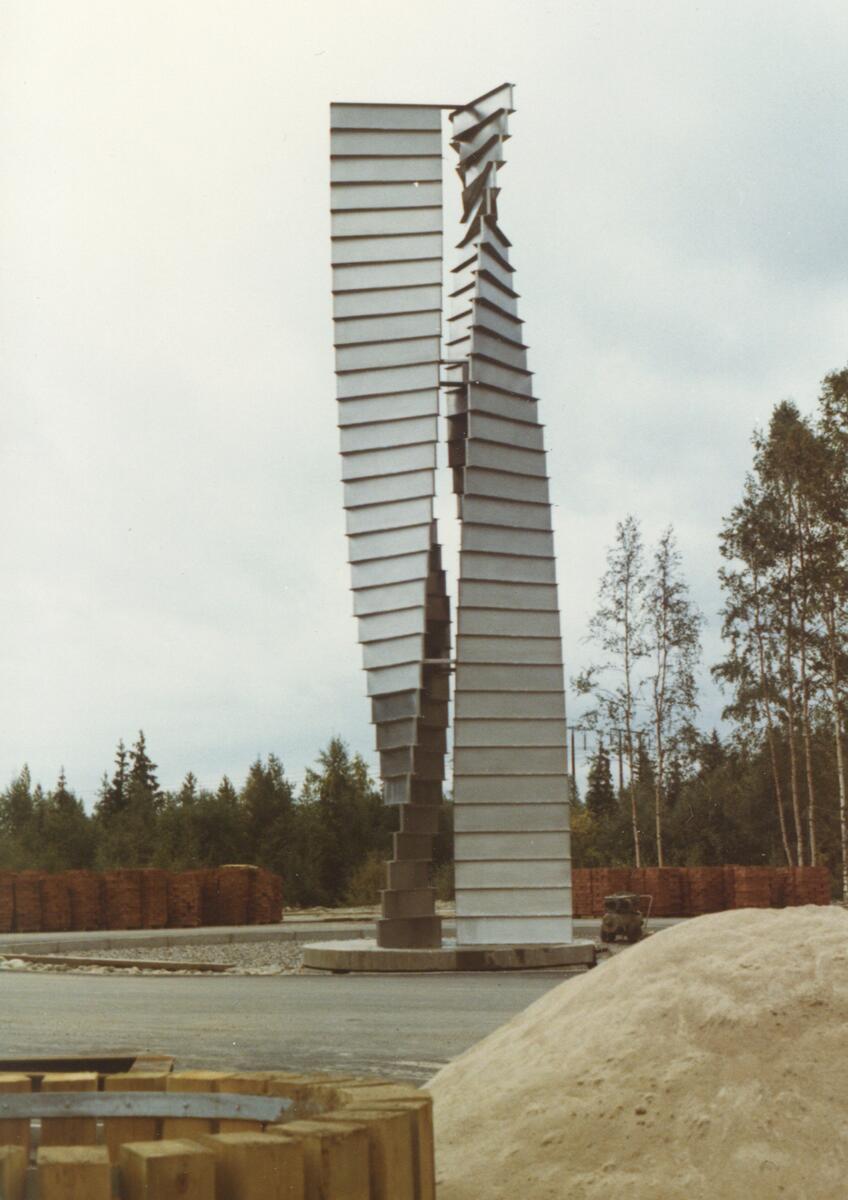 Skulptur, "Mänsklig byggnad". Uppförd i 10 meter rostfritt stål utanför Tekniska Högskolan i Luleå.