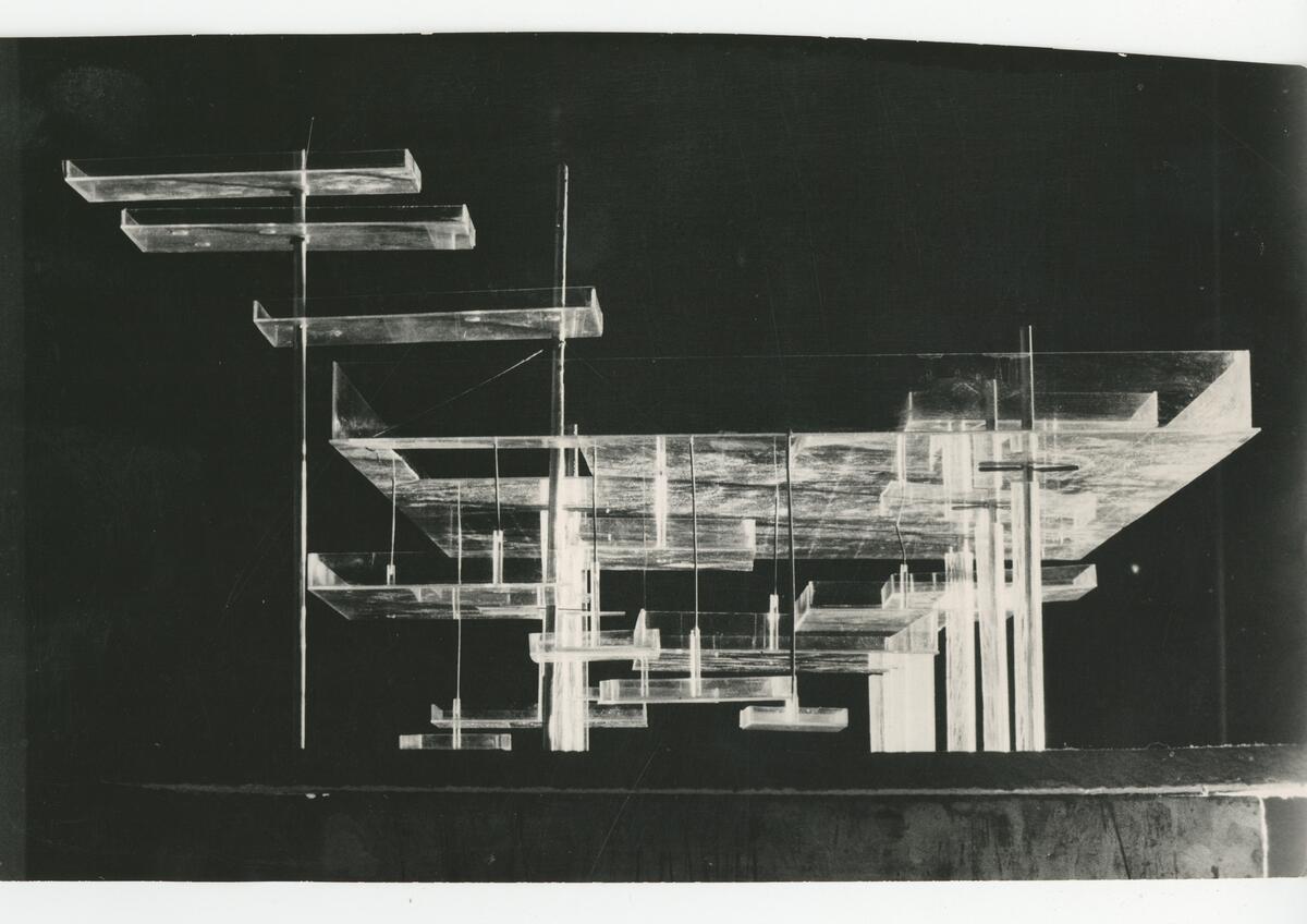 Glasfontän, modell, Anshelm och Jones. Skiss till tävling Seatle. Stor glasfontän finns vid Tekniska Högskolan, Lund.