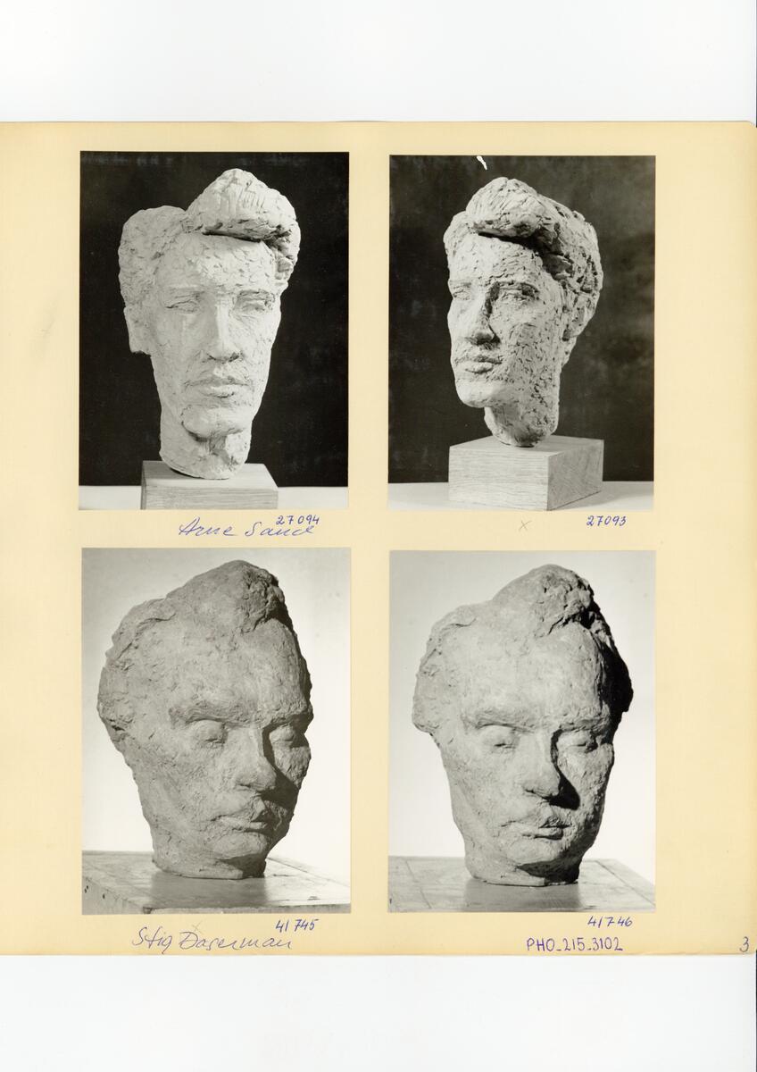 2 bilder av en skulptur, porträtt av Arne Sand, 2 bilder av en skulptur, porträtt av Stig Dagerman.