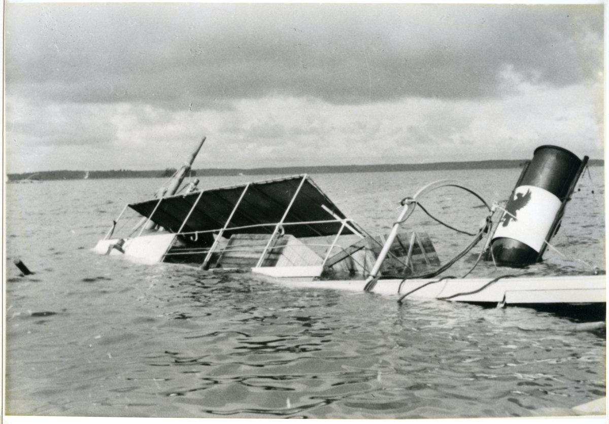 Kantrad båt med örn på skorstenen.
