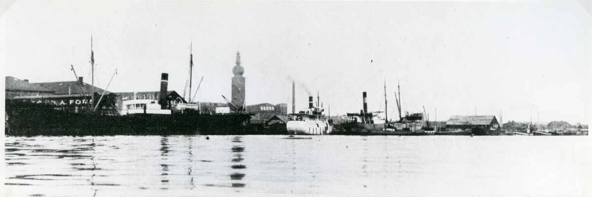 Vy över hamnområdet, med bl.a. ångfartyg.