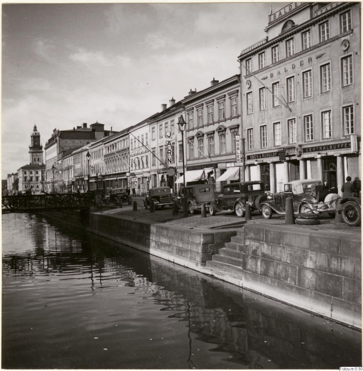 Sträckningsbild längs Norra Hamngatan och Stora Hamnkanalen, blick mot väster. I fonden rådhuset och Tyska Kyrkan.