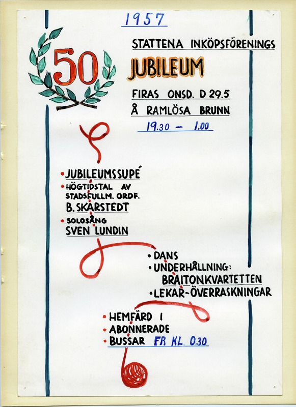 Album med fotografier, tidningsurklipp och festprogram, från jubileumsfesten för Stattena Inköpsförenings femtioårsfirande den 29 maj 1957 på Ramlösa Brunnshotell. Första sidan med text och program för festen, nästkommande sidor med tidningsurklipp och sånger till festen, därefter fotografier från festmiddagen och sist fotografier på butiken och huset.