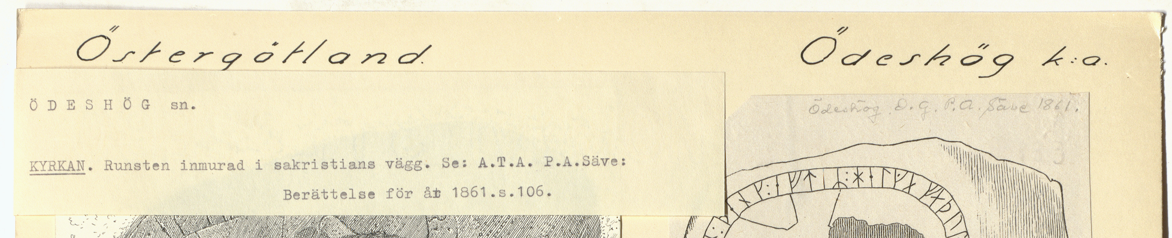 Beskrivning: Ödeshög sn, Kyrkan. Runsten inmurad i sakristians vägg. Se: A.T.A. P.A. Säve: Berättelse för år 1861, s.106.