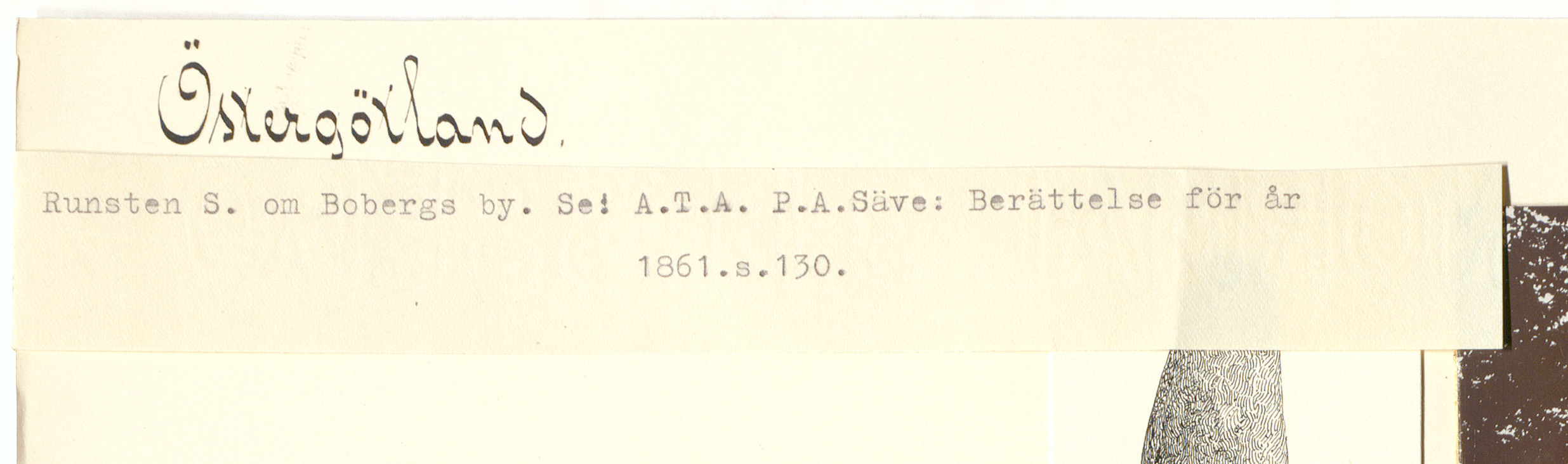 Beskrivning: Runsten S. om Bobergs by. Se: A.T.A. P.A. Säve: Berättelse för år 1861. s.130.