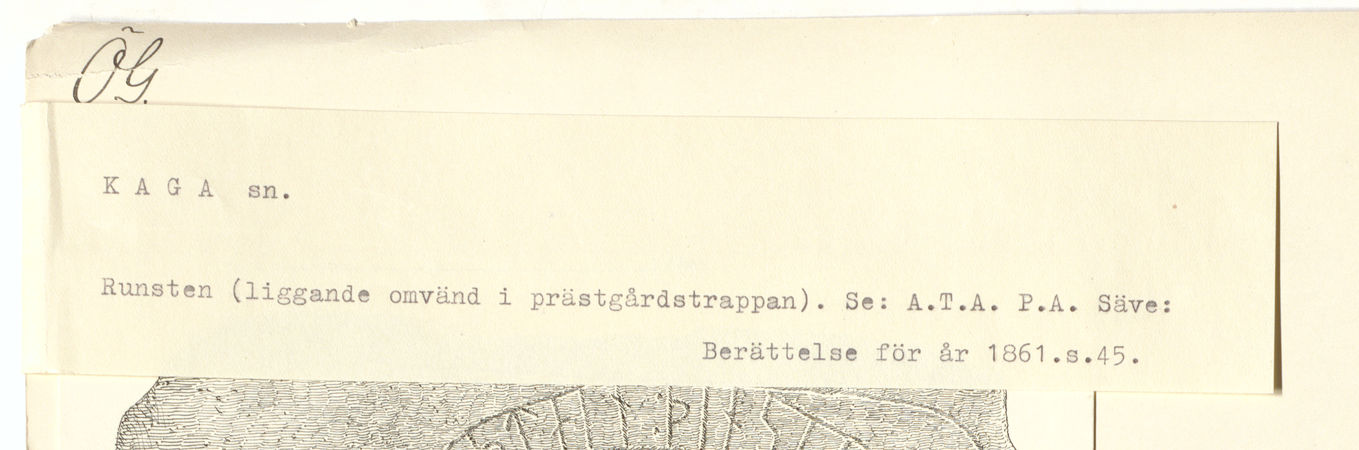 Beskrivning: Kaga sn, Runsten (liggande omvänd i prästgårdstrappan). Se: A.T.A. P.A. Säve: Berättelse för år 1861, s.45.