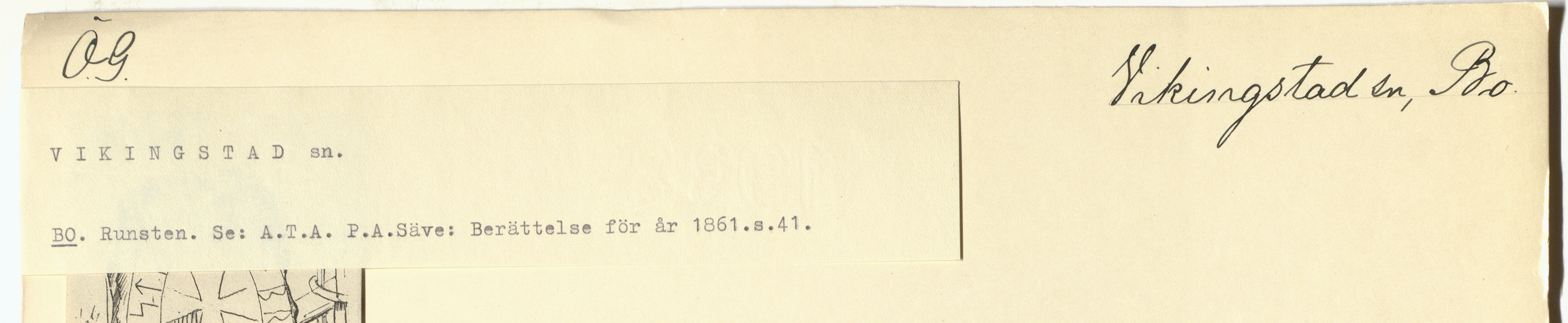 Beskrivning: Vikingstad sn. Bo. Runsten. Se: A.T.A. P.A. Säve: Berättelse för år 1861, s.41.