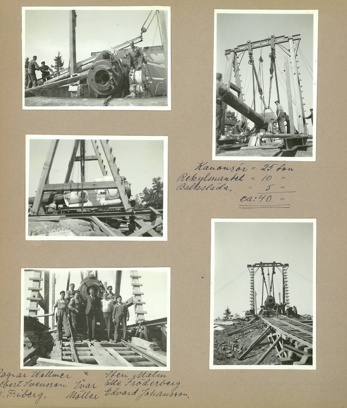Fotografier inklistrade på albumsida. Fem fotografier föreställande förflyttning av militärpjäser längs järnvägsspår. Det ena fotografiet (nere till vänster) porträtt av sju personer som arbetar med flyttningen. På albumsidan inskriven text vid fotografierna.