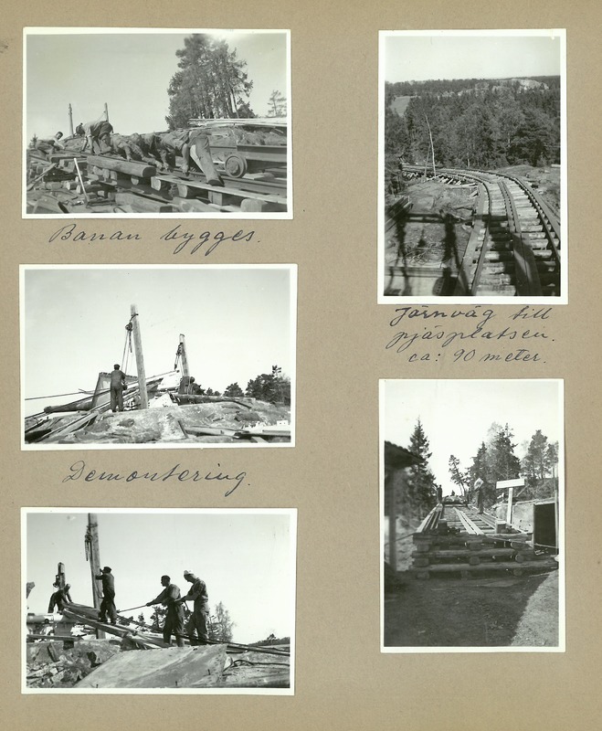 Fotografier inklistrade på albumsida. Fem fotografier: uppe till vänster ett fotografi föreställande bygget av en järnvägsbana, i mitten samt nere till vänster två fotografier föreställande kranar och arbete med demontering av en militärpjäs (?), till höger två fotografier föreställande järnvägsspår. P¨å albumsidan inskriven text vid fotografierna.