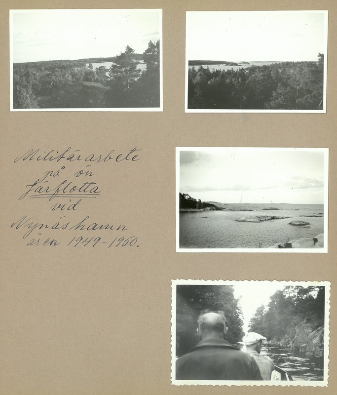 Fotografier inklistrade på albumsida. Fyra fotografier: upptill två fotografier föreställande skog och med skärgård/vatten i bakgrunden, i mitten ett fotografi föreställande skärgård med kobbar, nedtill ett fotografi föreställande två män bakifrån, möjligtvis sittande i en båt i ett vattendrag omgivet av skog. På albumsidan texten "Militärarbete på ön Järflotta vid Nynäshamn åren 1949-1950.".