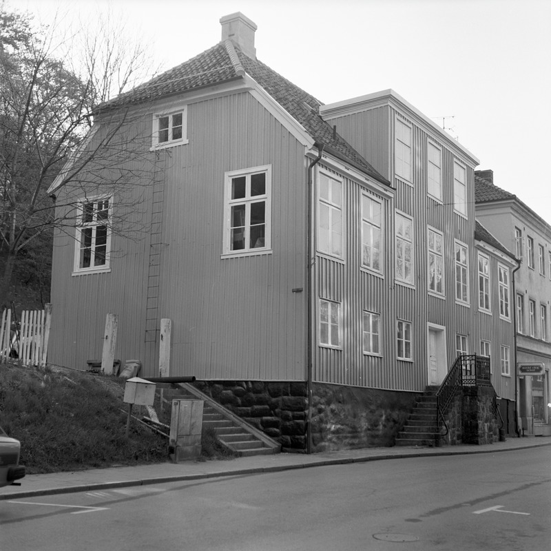 Bilden föreställer ett tvåvåningshuspå hög grund och en trappa framför och en på gaveln. I förgrunden gata.