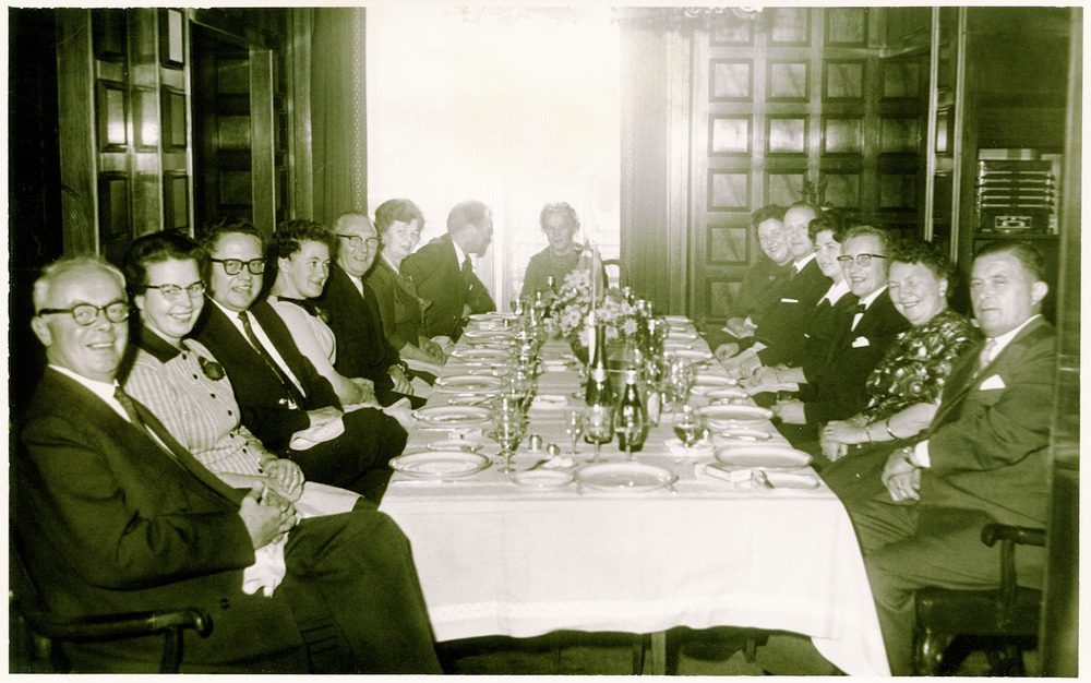 Fotografi föreställande fjorton personer sittande vid ett dukat bord.