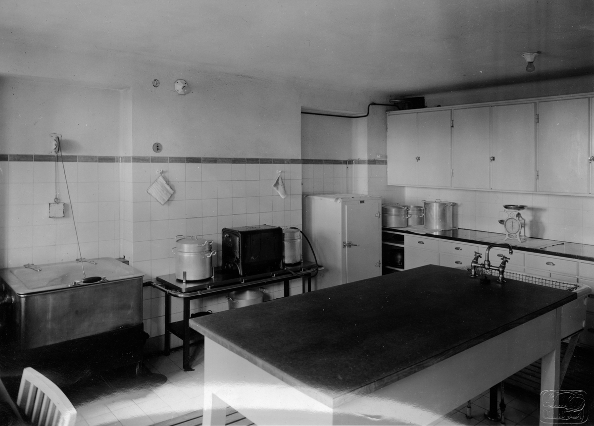 Mjölkköket. Kök. Bilder från Barnsjukhusets invigning i Linköping. Invigningen av Blåklintshemmet år 1931. Bilder från Blåklintshemmets invigning år 1931.
