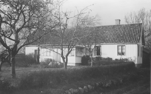 Mossen, Onsala. Mangårdsbyggnaden och trädgården, som hägnas av en låg häck. De fyra Mossen-gårdarna ligger samlade likt en by i socknens norra del. Förr var torvupptagningen i de stora mossarna här mycket betydelsefull för bränslebehovet i denna trädfattiga trakt.