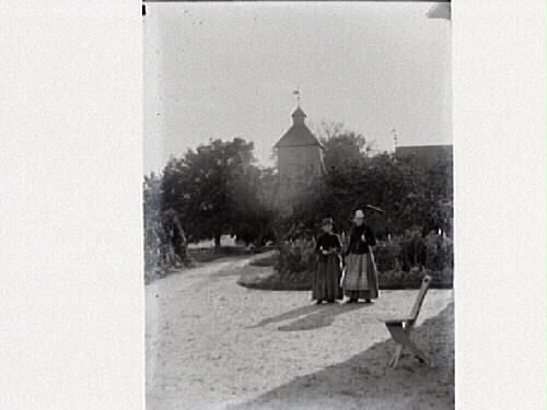 Två kvinnor på en grusplan med en stol i förgrunden och ett kyrktorn i bakgrunden.