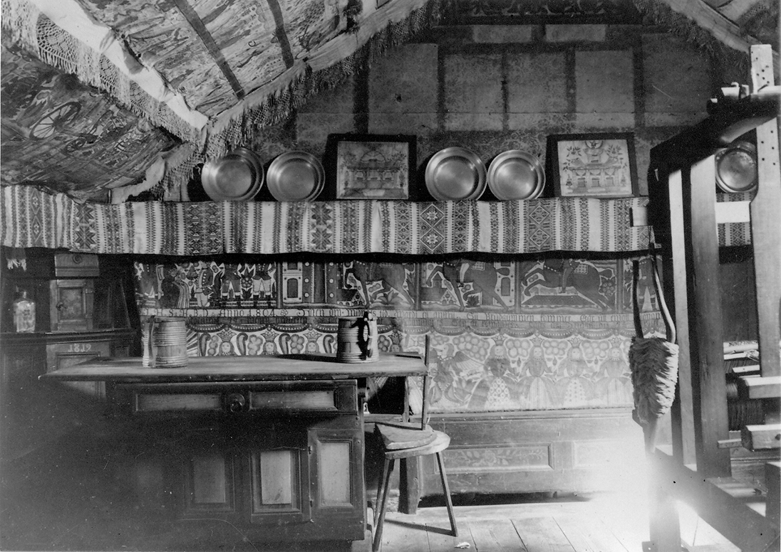 Interiören av den på ursprungligt sätt julbonade ryggåsstugan från Jonsnahult, flyttad till Bollaltebygget i Knäred socken.