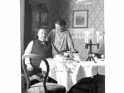 Fotografen Gerda Winqvist med sin (halv)bror Fredrik Winqvist på Annandag jul 1931 vid dukat bord med tända juleljus.