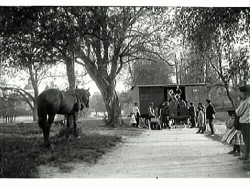 Ett flyttlass med koffertar på en kärra med en skara människor omkring, framför en tågvagn i en park. På lasset står en man och håller en stol Till vänster står hästen och väntar.
