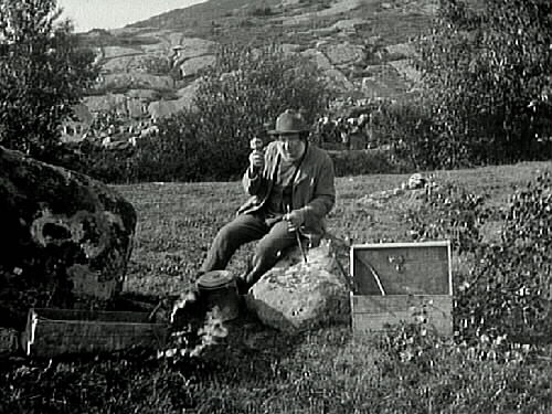 En stensprängare med skepparkrans sitter på en sten och drillar hål i den, omgiven av sina verktyg och redskap. I bakgrunden en bergssluttning. (Samme man på neg.nr. E5266.)
