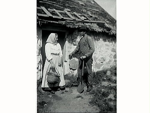 En arbetsklädd man med spade och en ung kvinna med korgar framför dörren till en stenstuga med halmtak.