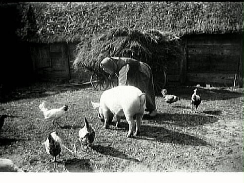 Gumma med gris och höns vid en skiftesverkslada med halmtak. Bakom henne står ett hölass.