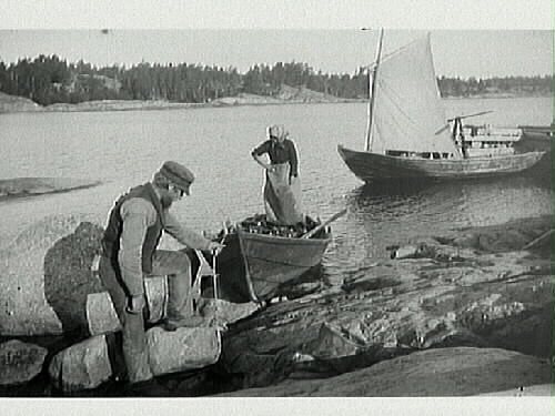 Ett fiskarpar, kvinnan står i båten och mannen håller in ekan mot stenhällarna. Även en segelskuta syns i bild.