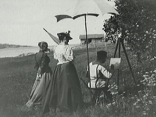 Konstnär vid staffli - ser ut att vara Severin Nilson själv - under parasoll i havsmiljö med två kvinnor som studerar hans måleri.