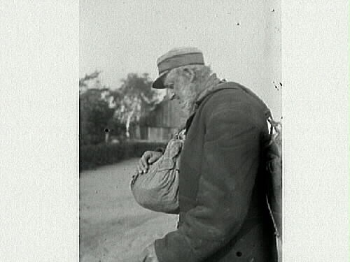 Äldre man med knyten i en bärrem över axeln (luffare? knalle?).