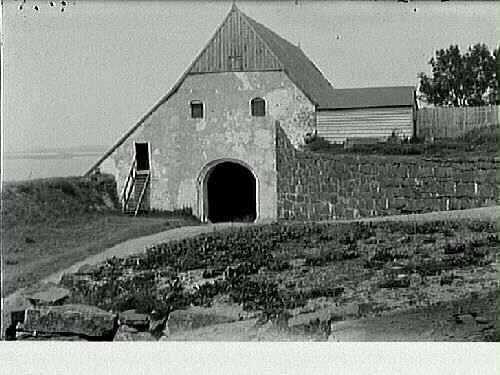 Varbergs fästning, mellersta valvet sett från söder. En tillbyggnad av trä samt ett högt spjälstaket angör åt öster.