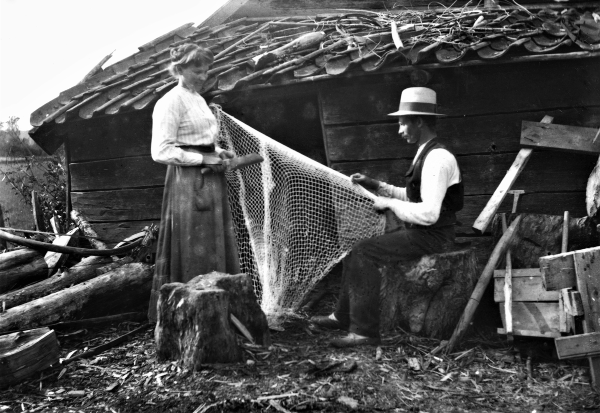 Kvinna och man lagar nät på vedbacken. Boden har enkupigt taktegel.