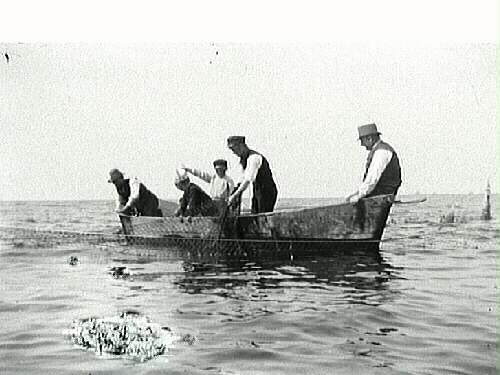 Laxfiske. Näten vittjas, eller "laxsättet ryktas" som man säger i Halland. Tre män och två pojkar i båten