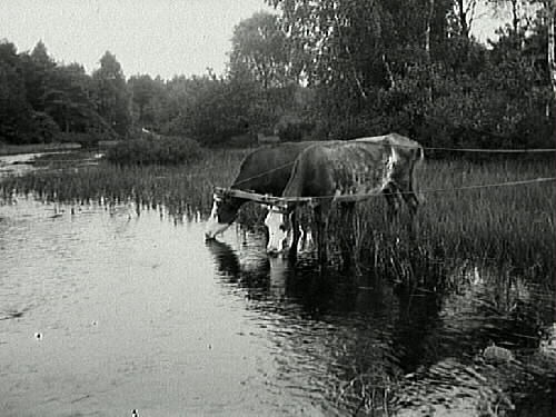 Dragdjur, som hjälper till vid höbärgningen, dricker i en å.