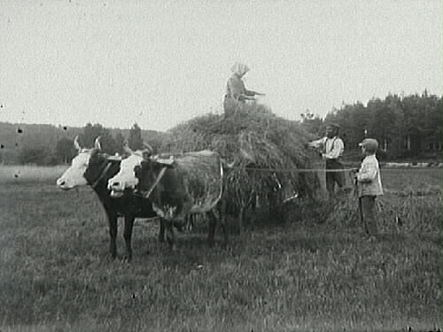 Höbärgning. Två dragdjur är spända för hölasset och hålls av en pojke. En kvinna trampar höet på kärran och en man hivar upp mer.