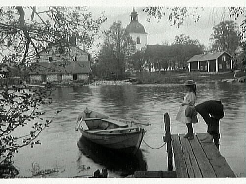 Flicka och pojke på brygga med båt. På andra sidan vattnet en kyrka, ett timrat hus samt en stor stenbyggnad.