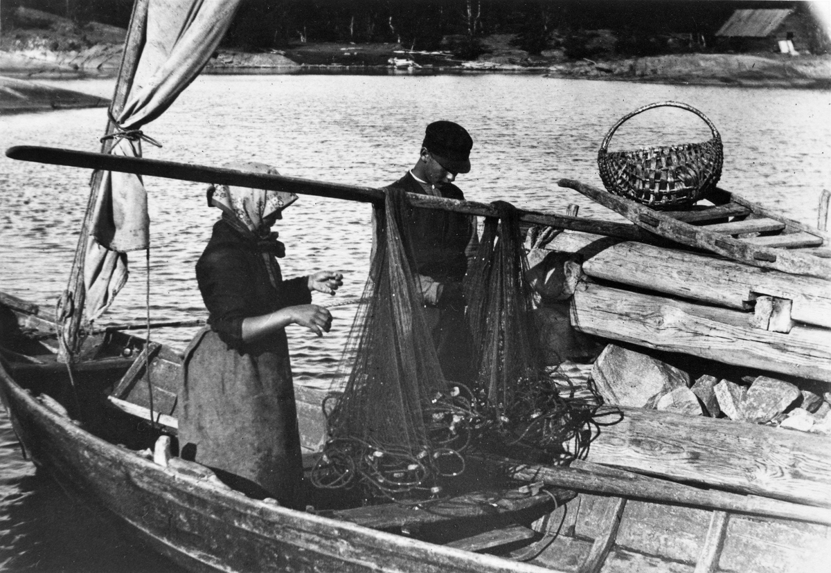 En pojke och en flicka reder fiskenäten (garnen) i en segelbåt.