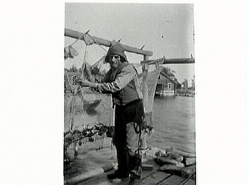 Fiskare vid sitt fiskenät på en brygga med ett båthus i bakgrunden.