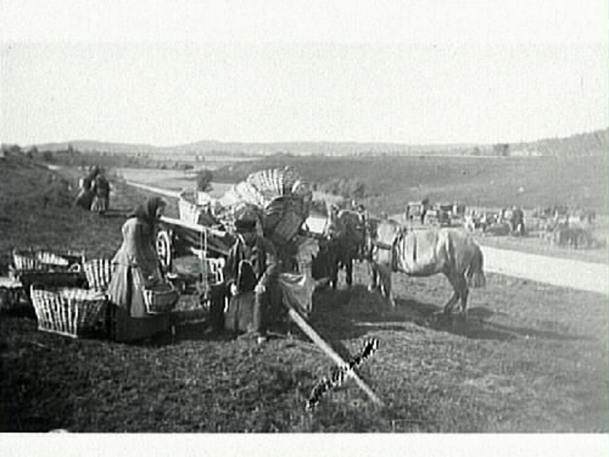 Korgmakaren Bengt Aron Andreasson sitter på sin vagn full av korgar. Till vänster står Severins syster Charlotta Nilson bland stora flätade korgar och i bakgrunden syns fler hästekipage. Sjönevads marknad.