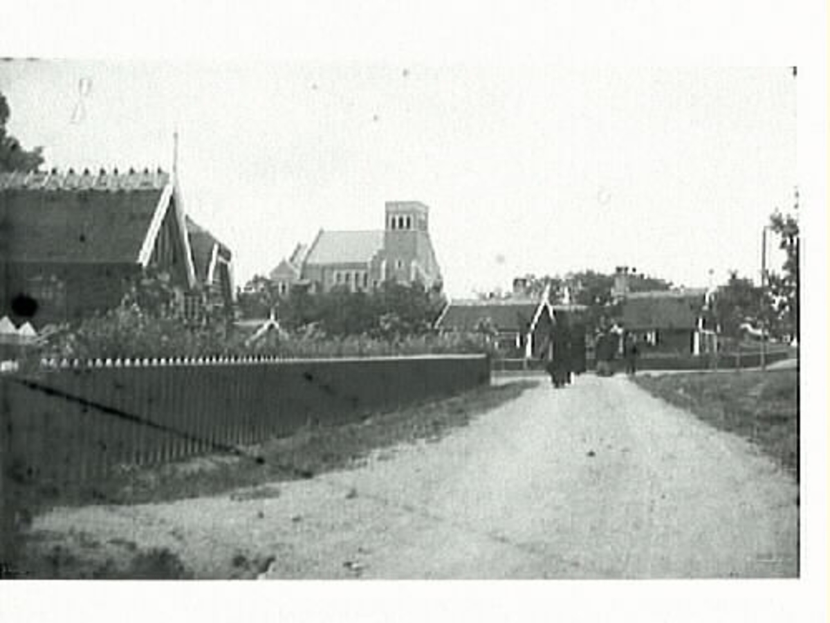 Bygatan genom Tjolöholms arbetarby med kyrkan i fonden. Ett sällskap går på vägen. Kyrkan ritades, till skillnad mot övriga byggnader, av göteborgsarkitekten Hans Hedlund. Han var en vän till släkten Dickson och hade redan ritat flera byggnader som deras olika stiftleser låtit uppföra. Kyrkan invigdes i oktober 1904.