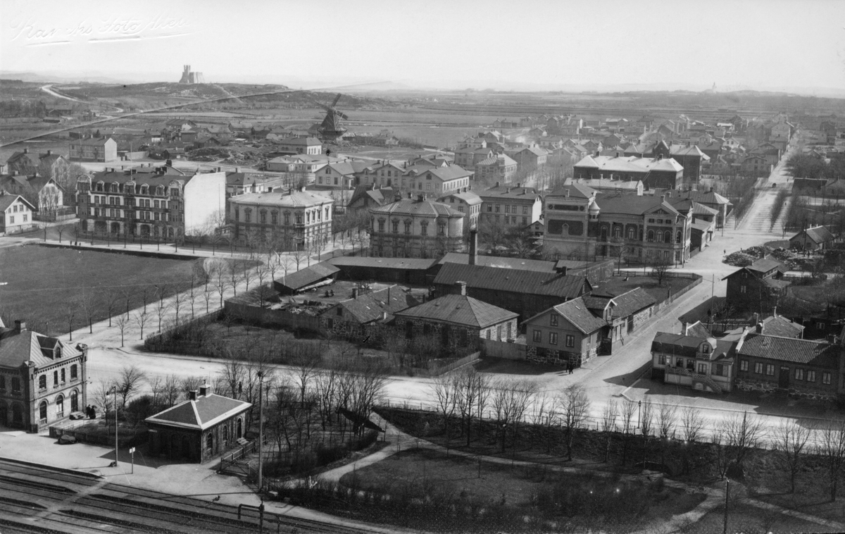 Stadsvy tagen mot öster från kraftstationens skorsten över Varbergs bebyggelse öster om järnvägsstationen. I förgrunden syns järnvägen och dess park, Västra Vallgatan samt Varbergs mekaniska verkstad. Parallellt med Västra Vallgatan går Kungsgatan som korsas av Engelbrektsgatan till höger, där Varbergs teater ligger, och till vänster Eskilsgatan som flankeras av två likadana hus, kallade Tvillinghusen. Allén på Eskilsgatan är helt ung och späd. I bakgrunden syns först en kvarn och längre bort skymtar vattentornet.