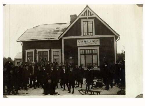 Vykort med stationshuset vid järnvägshållplatsen i Åkulla utmed Varberg-Ätrans järnväg, invigd 1911. Det är taget vintertid och en mängd resenärer är samlade på hållplatsen och i förgrunden syns en kälke. Byggnaden har nationalromantiska drag i sin arkitektur.
