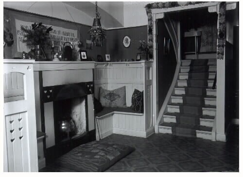 Interiörer från en bostad i juletid, troligen Victor Steffens hem, "doktorsvillan" i anslutning till Fagereds sanatorium där han var överläkare. Bild 1: Rum med öppen spis omgiven av väggfast bänkinredning. Över spisen sitter en stor bonad med broderat ordstäv och framför spisen ligger en stor broderad kudde. En trappa leder upp till nästa våning. Allt är i tidstypisk nationalromantik/senjugend (sanatoriet uppfördes 1912-1914). Bild 2: Rum med julgran, sittgrupp, bokhylla och öppen pardörr in till nästa rum.