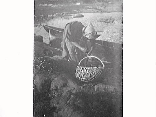 Kvinna i huckle står böjd över fiskenät med en stor korg i förgrunden. Bakom henne syns en eka.