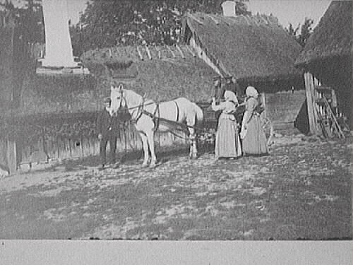 Hästekipage med en vit häst, två män i kärran och en som håller hästen. Vid vagnen står två kvinnor i hucklen. De står vid en högloftsstuga i Årstad med hög vit skorsten, halmtak och ett takfönster i ryggåsstugan i mitten.