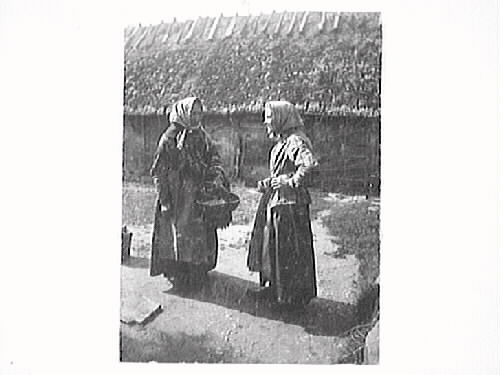 Charlotta, Severins syster, samtalar med en kvinna ute på gårdsplan. Charlotta står med handen i sidan (till höger). I bakgrunden syns en lada med stråtak. Björsgård.