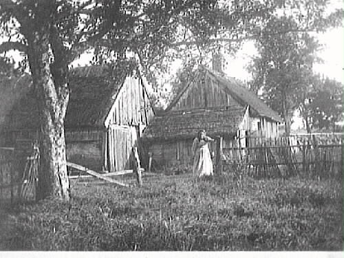 " Sev. Nilssons första hem m. Charlotta, S:s syster" står det antecknat på fotografiets baksida. Severin föddes på Forsa Kvarn, men detta är ingen kvarnmiljö. Det kan betyda att de besöker något av de andra ställen syskonen bodde på under barndomen, men sannolikt föreställer det trots allt Björsgård. Sedan Severin köpt gården lät han flytta dit torpet Sveaberg från Knobesholms ägor, där han bodde från 7-årsåldern och ca 10 år framåt. På Björsgård bodde sedan modern Neta Beata, systern Charlotta Nilson och hennes son Karl. Gården var kringbyggd med längor uppförda i skiftesverk. Bilden bör visa norra längan till vänster och västra längan till höger.